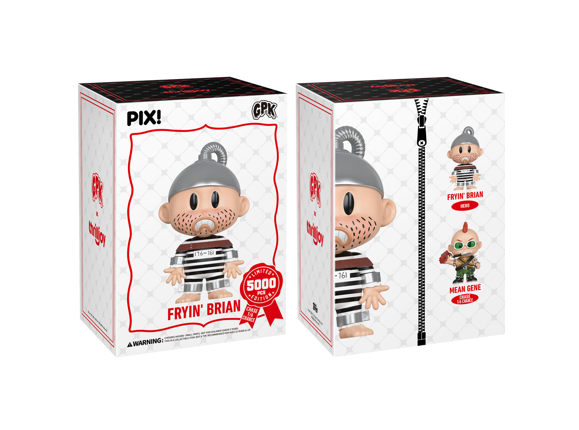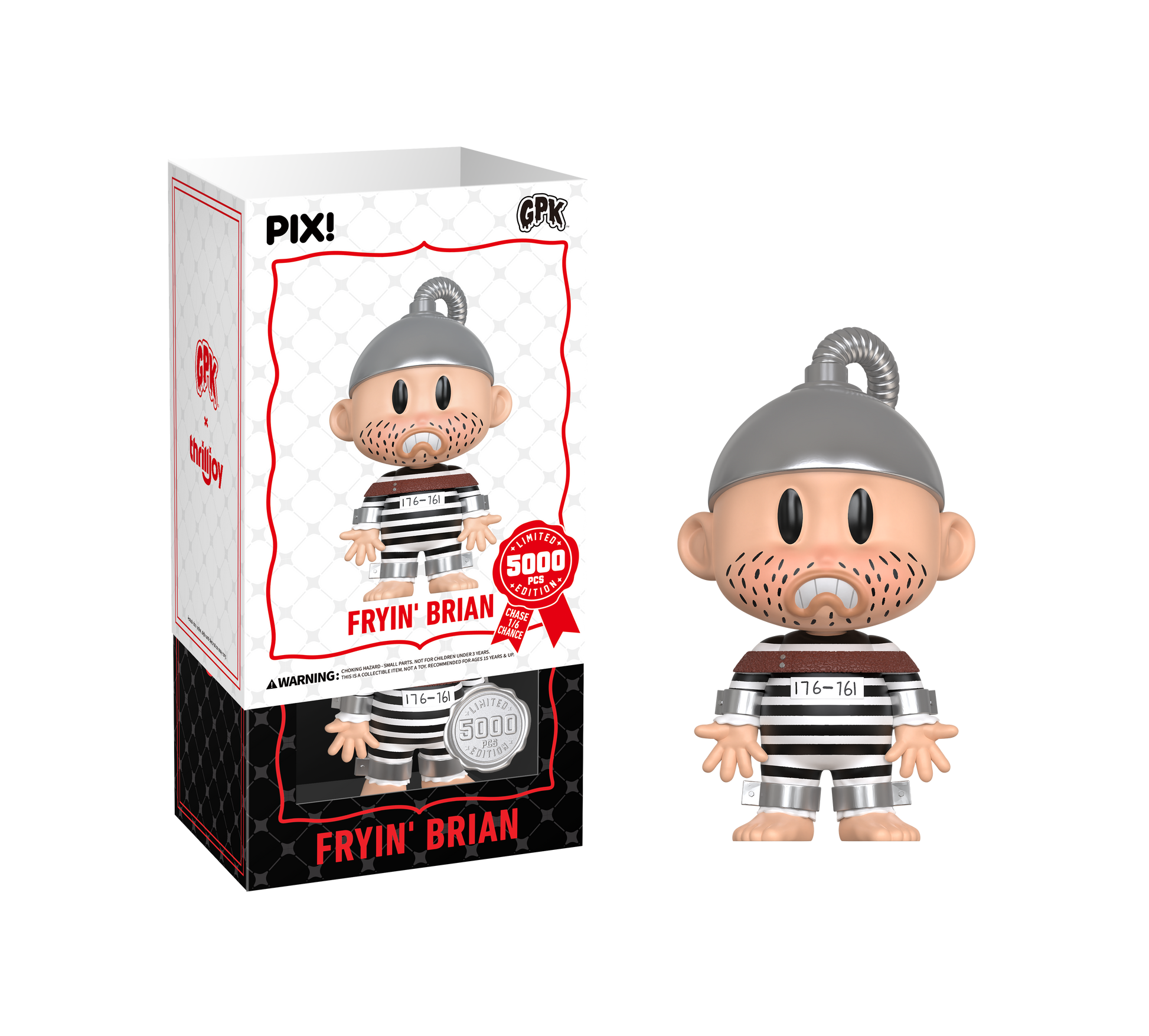 This PIX! is going to be a shocking addition to your collection! Featuring Fryin’ Brian, looking scruffy and terrified, wearing his black-and-white prison uniform, the metal conductor on his head and his restraints still attached to his ankles and wrists! Fryin’ Brian is jolting straight to your shelves! This PIX! is perfect for all fans of Garbage Pail Kids!