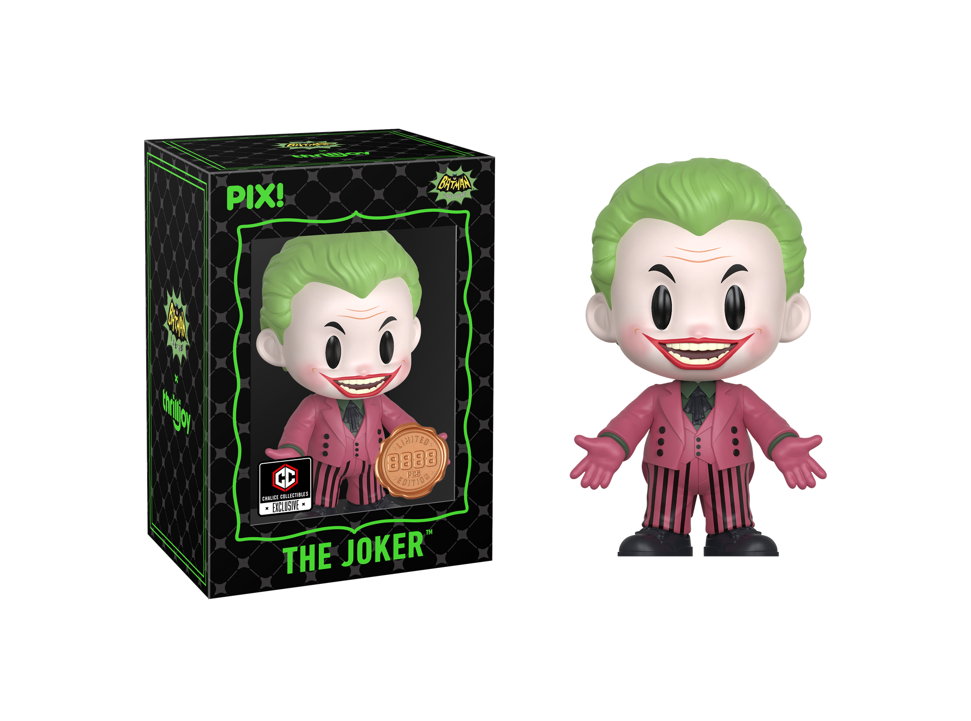 A joke a day keeps the gloom away! Featuring Joker with his bright green hair, chalk-white face, and wide, red-painted grin, dressed in his iconic magenta suit! The Clown Prince of Crime is bringing mayhem straight to your shelves! This PIX! is perfect for all fans of classic superhero films!