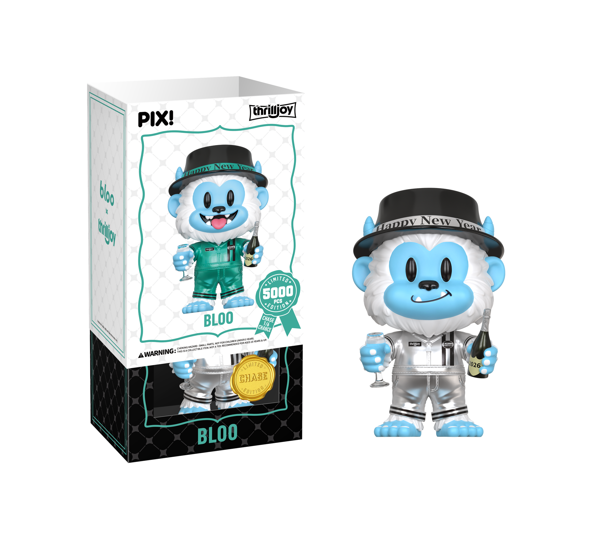 HAPPY NEW YEAR! Get ready to kick off 2026 with Bloo in a metallic teal jumpsuit, New Year’s hat, and his signature big smile, holding a champagne glass in one hand and the bottle in the other! Bloo is partying straight to your shelves!