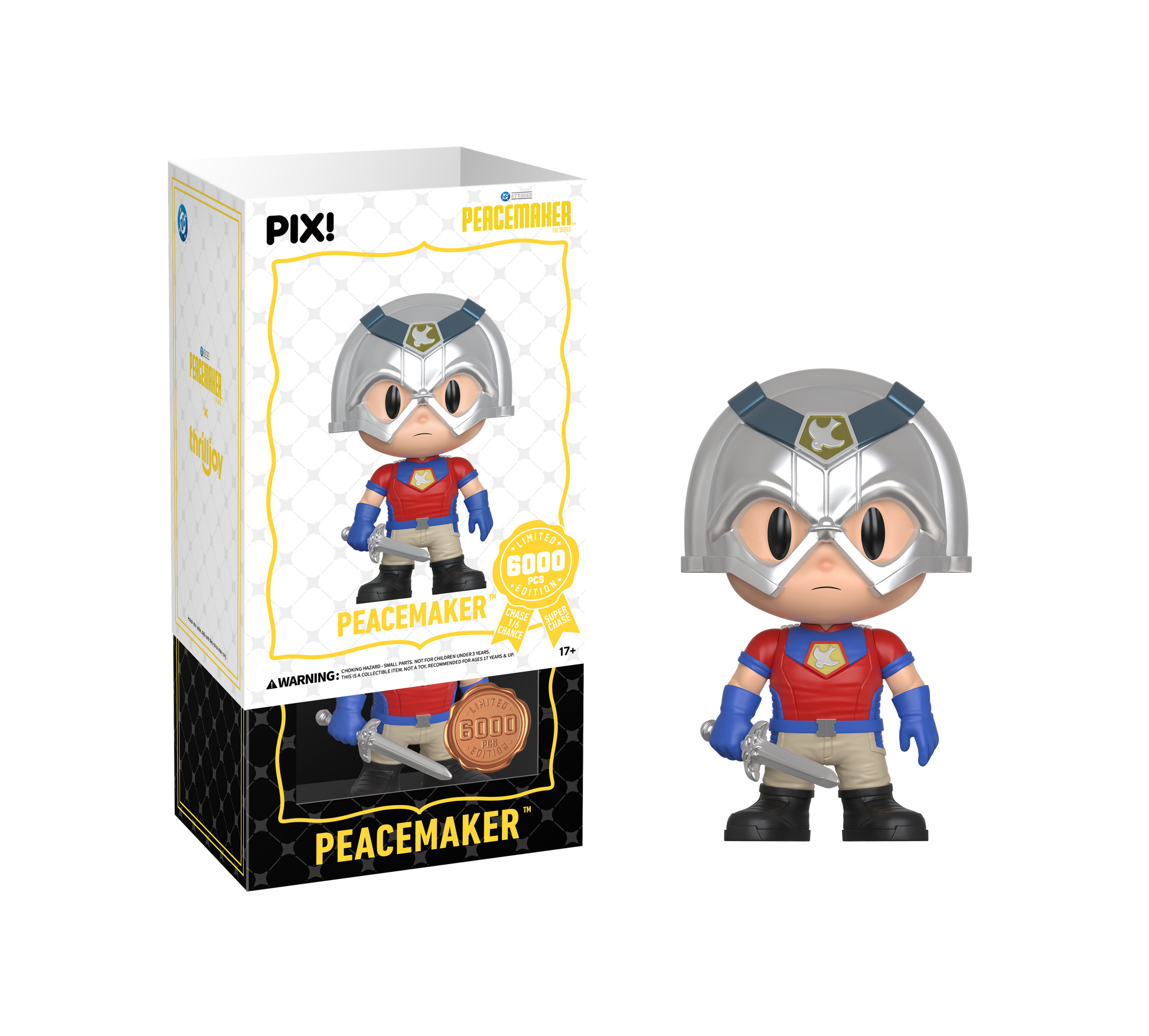 I cherish peace with all my heart…Featuring the Peacemaker in his iconic silver helmet, blue-and-red shirt, khaki pants and blue gloves, wielding a sword in hand! The Peacemaker is heading straight to your shelves! This PIX! is perfect for all fans of superhero films!
