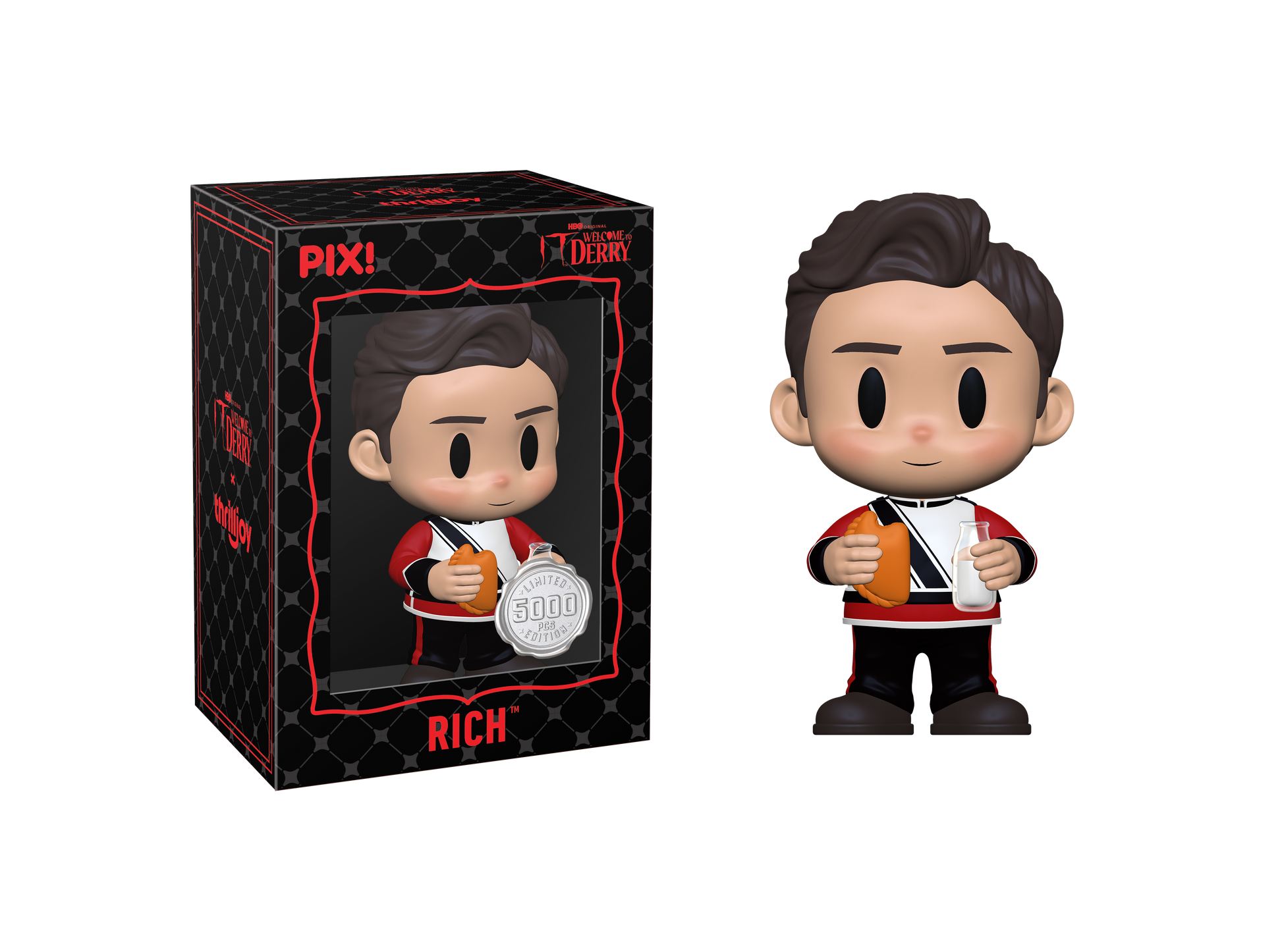 Knights also protect fair maidens… Featuring Rich Santos with his slicked-back hair, dressed in his iconic red, black, and white band uniform, with a slight smirk on his face, holding an empanada in one hand and milk in the other! Rich is running straight for your shelves! This PIX! is perfect for all fans of horror!